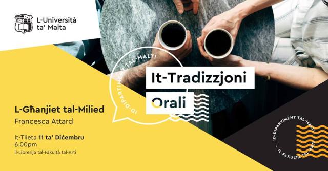 Nhar it-Tlieta, 11 ta’ Diċembru 2018, fis-6.00pm, Francesca Attard se tagħmel taħdita fis-sensiela dwar It-Tradizzjoni Orali bit-tema, “L-Għanjiet tal-Milied.” Din it-taħdita, organizzata mid-Dipartiment tal-Malti tal-Università, hija miftuħa għal kulħadd u se ssir fil-Librerija tal-Fakultà tal-Arti fil-bini tal-Università ta’ Malta f’Tal-Qroqq.